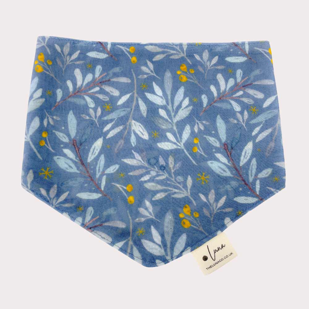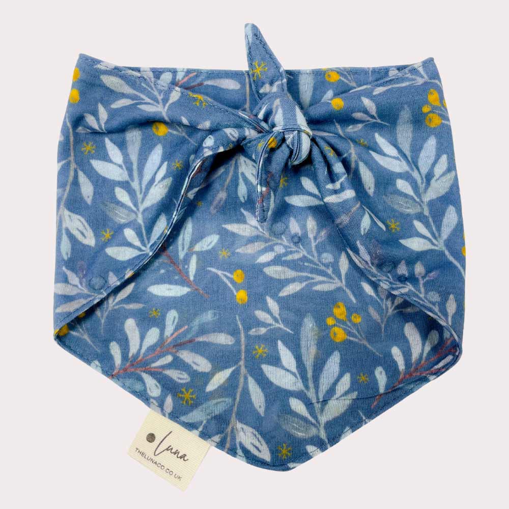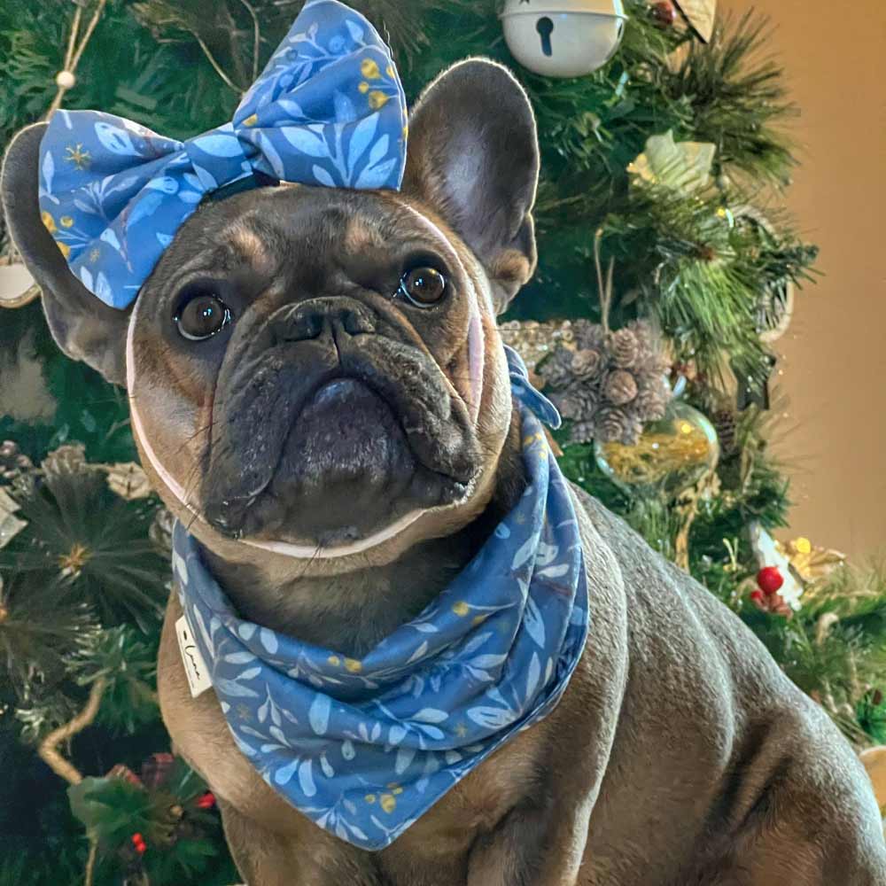 Our “Frost & Berry” Dog Bandana is for the dogs who skip the chaos and head straight for the twinkle lights. With soft frosted leaves, golden berries, and a muted blue background, it brings understated elegance to every festive moment — from icy morning strolls to fireplace snoozes.
