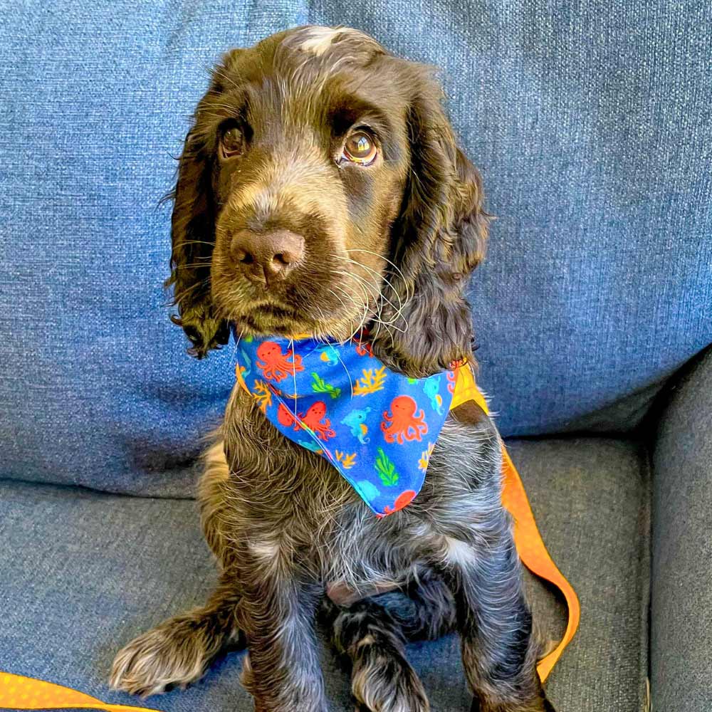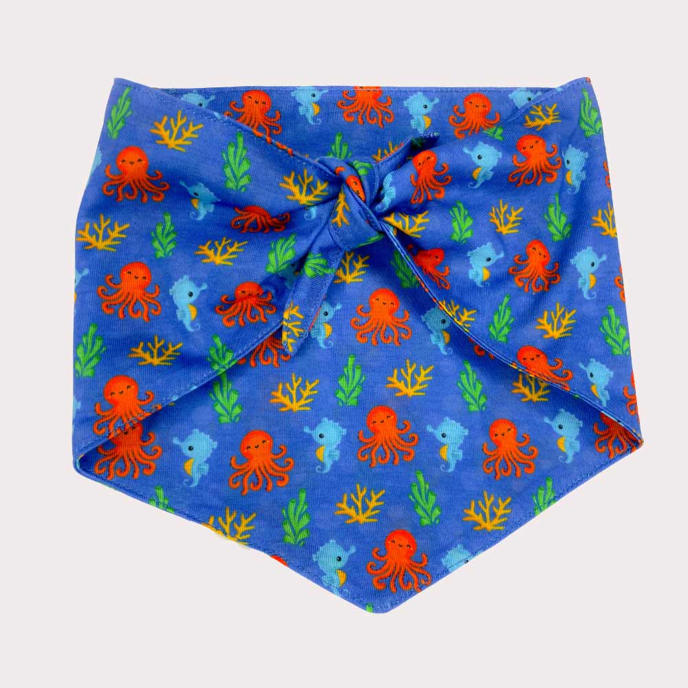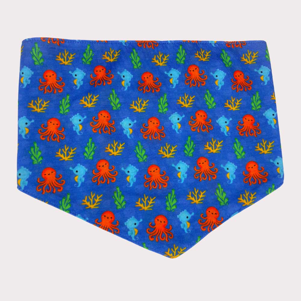 For pups who live for beach days, salty breezes, and chasing waves — the “Under the Sea” Dog Bandana is an ocean-inspired print full of coastal charm. With coral reefs, cheeky octopuses, and dapper seahorses on a deep blue base, this one brings the sea to every stroll.