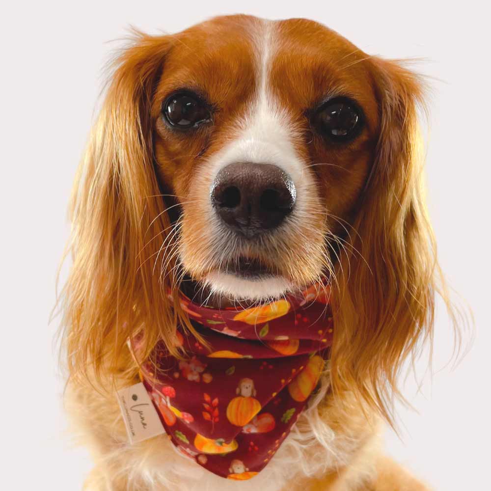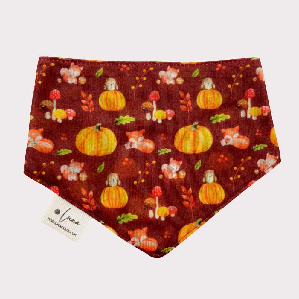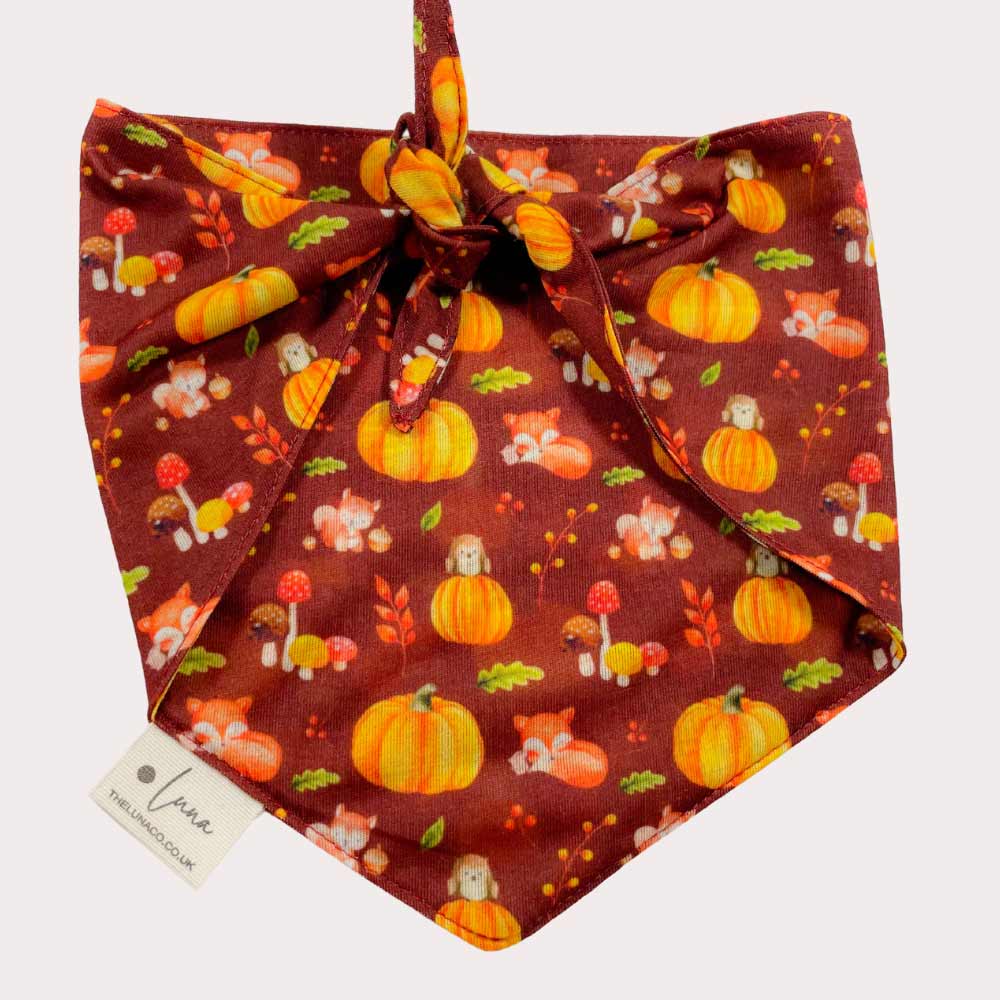 Our “Woodland Creatures” Dog Bandana is a warm, playful print designed for autumn-loving pups. With sleepy foxes, owls, pumpkins, and toadstools on a deep rust-red background, it’s a harvest-season dream for dogs who like to sniff every leaf and snooze in style.