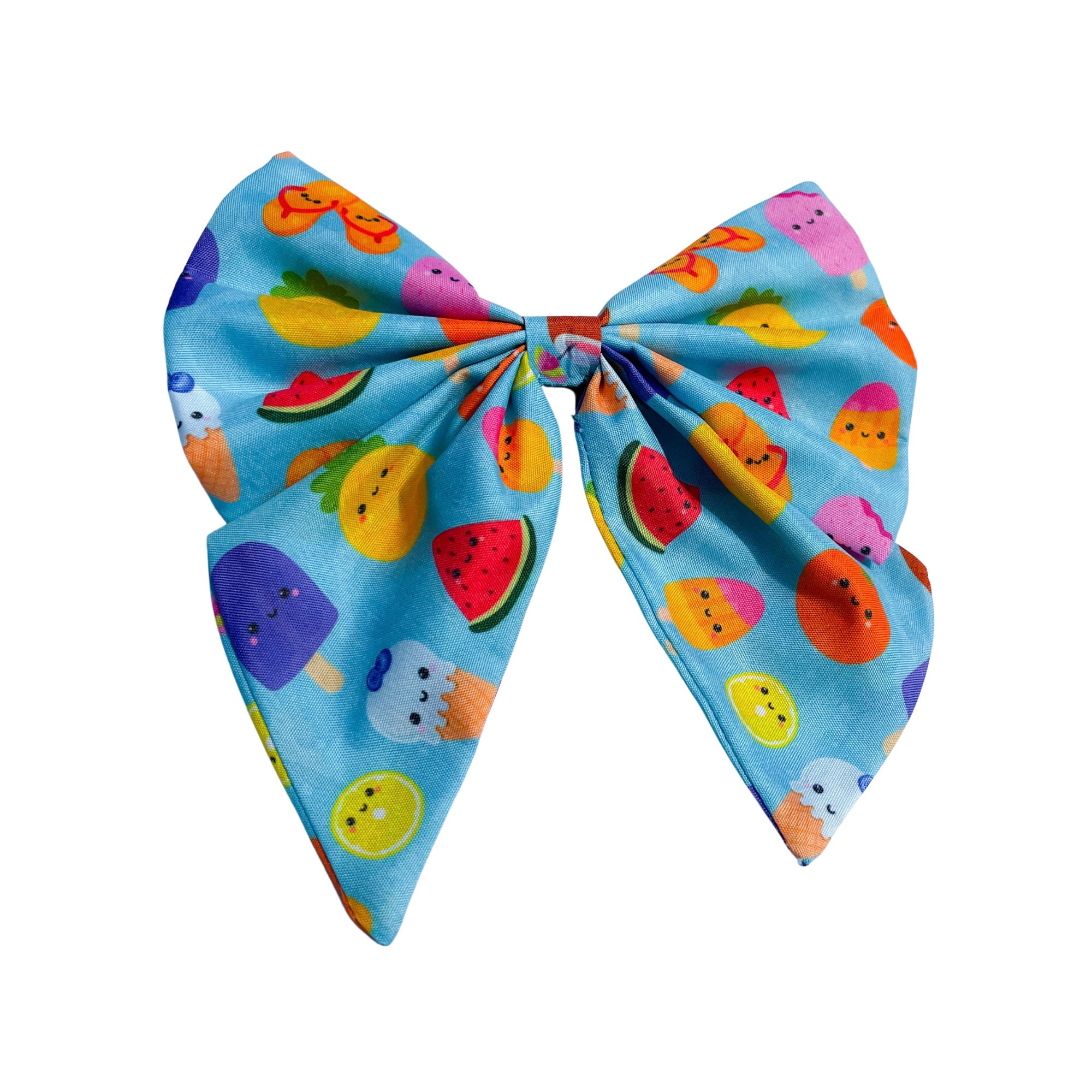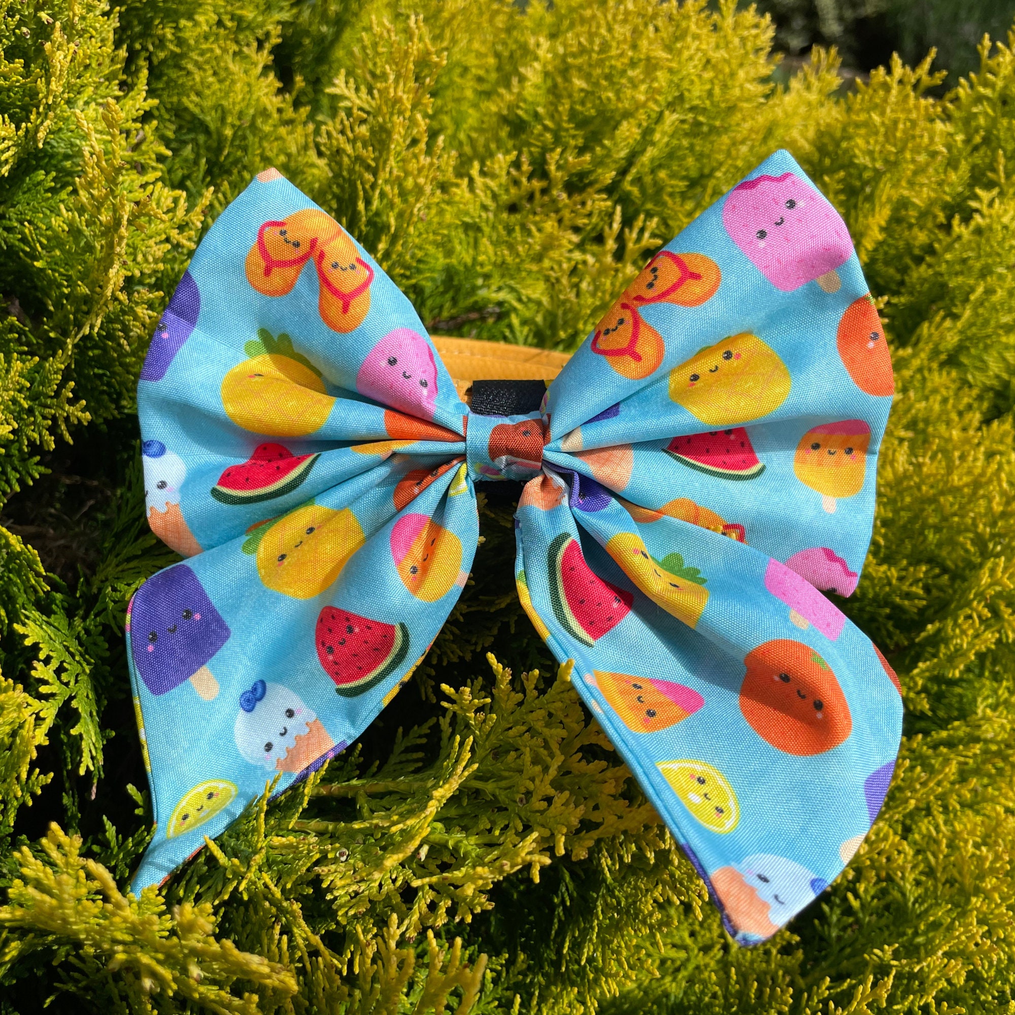With an ice cream and tropical fruits pattern, "Tropical Party – Blue" sailor bows are soft and comfortable, plus very easy to fit perfectly on your dog's collar or harness with hook and loop fastening to ensure a secure and snug fit – our bow ties won't slide or move around.