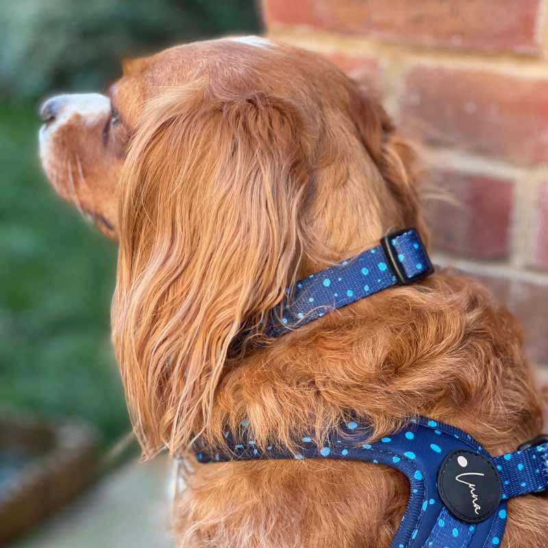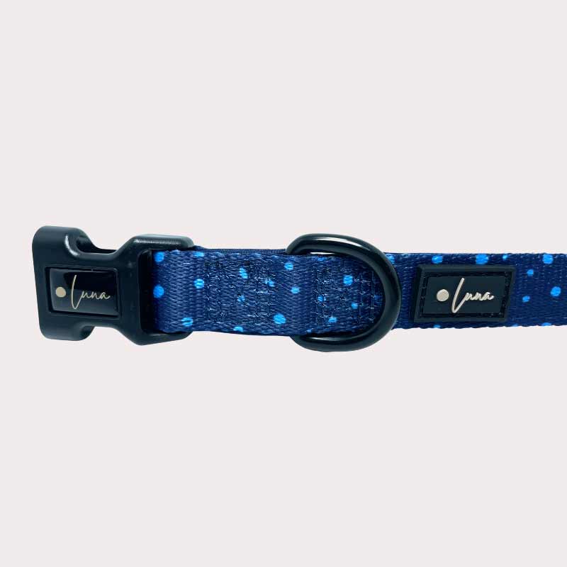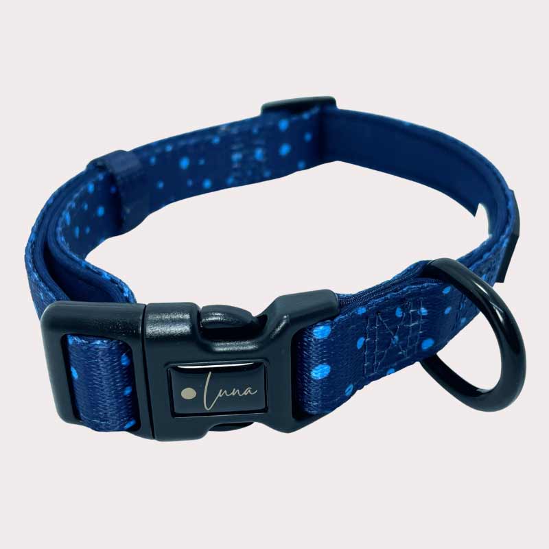 Cool, confident, and built for everyday comfort — this polka dot collar in rich navy blue is perfect for pups who like to keep things classic. Lined with cushioned neoprene and finished with sleek black hardware, it’s made for everything from woodland adventures to Sunday brunch on the patio.