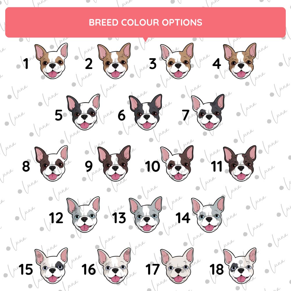 - Custom cartoon-style Boston Terrier illustration in your choice of breed colouring