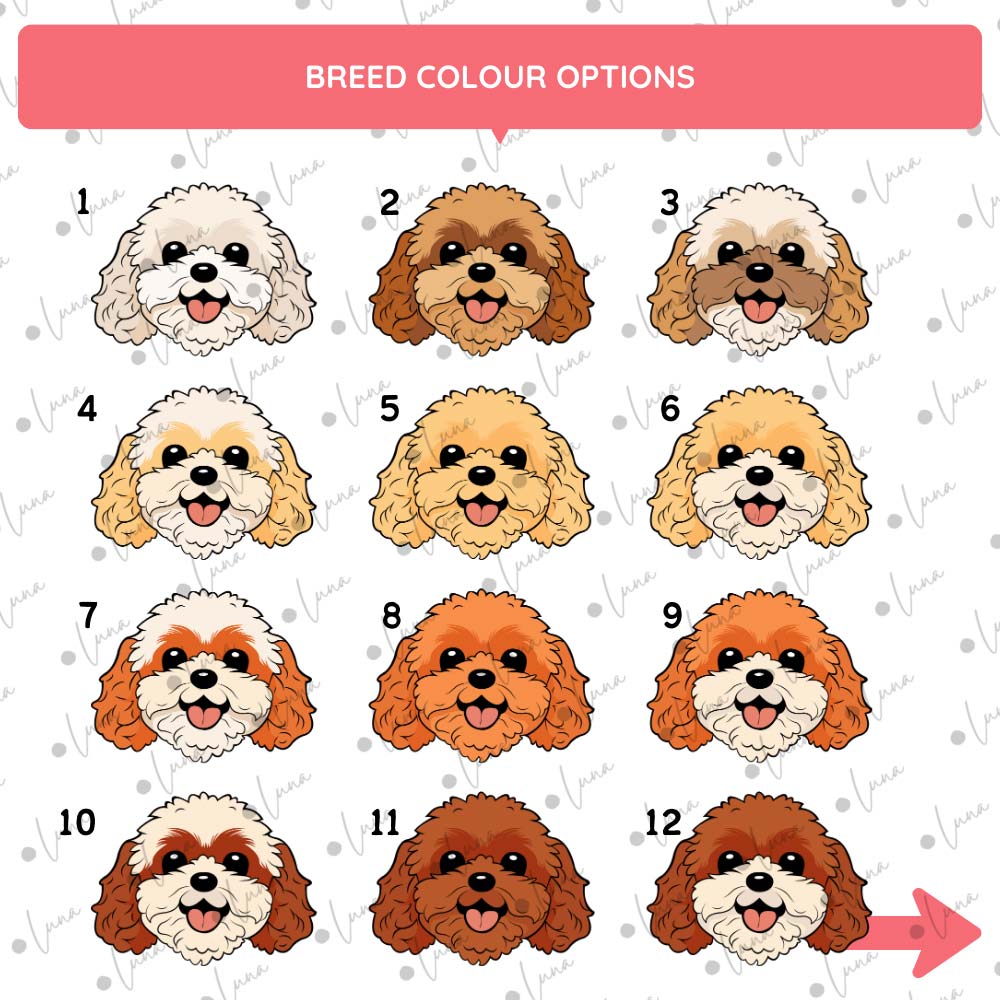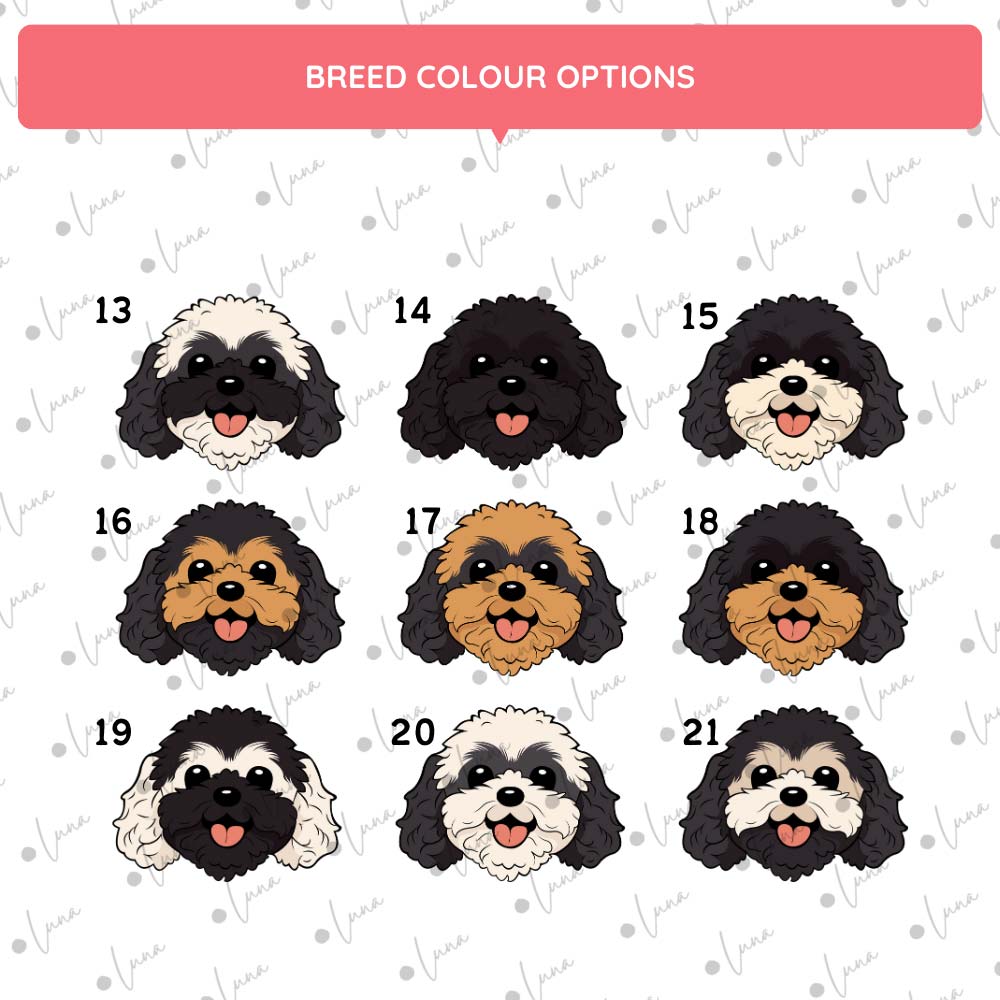 - Cartoon-style Cavapoo illustration with your chosen breed colouring