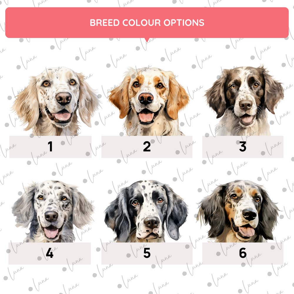 Elegant, gentle and endlessly graceful, the English Setter is known for its feathery coat and sweet, sociable nature. Whether bounding through the countryside or dozing by the fire, they do everything with a certain refined charm. This watercolour-style tag captures their soft expression and flowing coat with delicate brushwork that mirrors their effortless beauty.