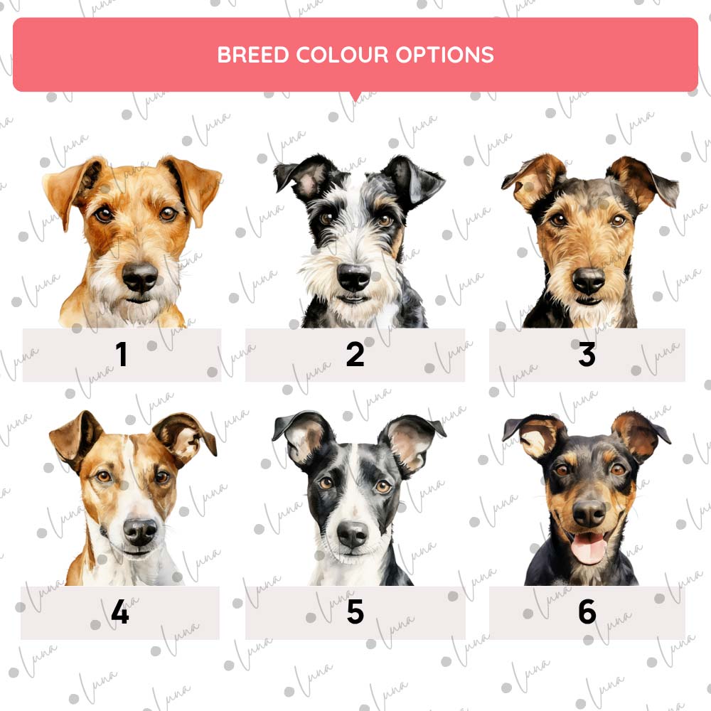 Our personalised Fox Terrier ID tag features a soft watercolour-style illustration with your choice of breed colouring, background and personalisation. A beautiful and practical way to show off your pup’s personality.