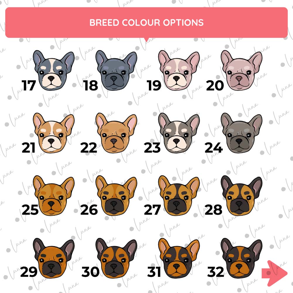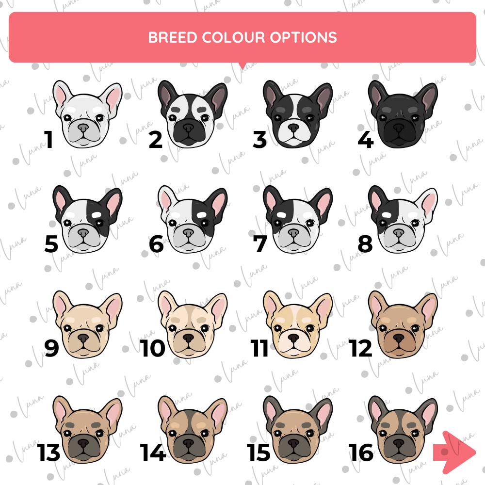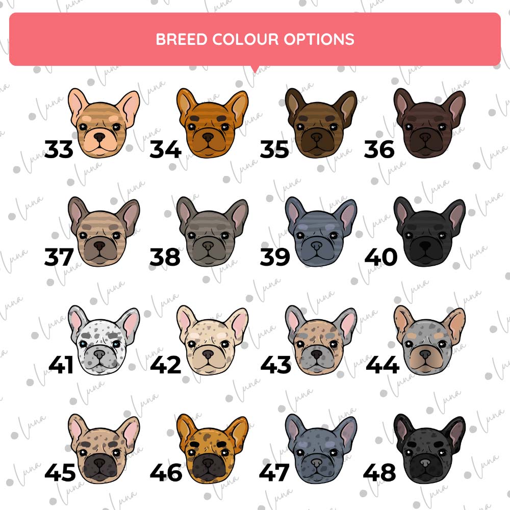 - Cartoon-style Frenchie design with your chosen breed colouring