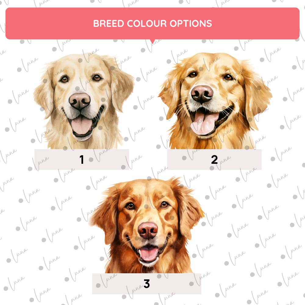 - Soft watercolour-style Golden Retriever illustration with your chosen breed colouring
