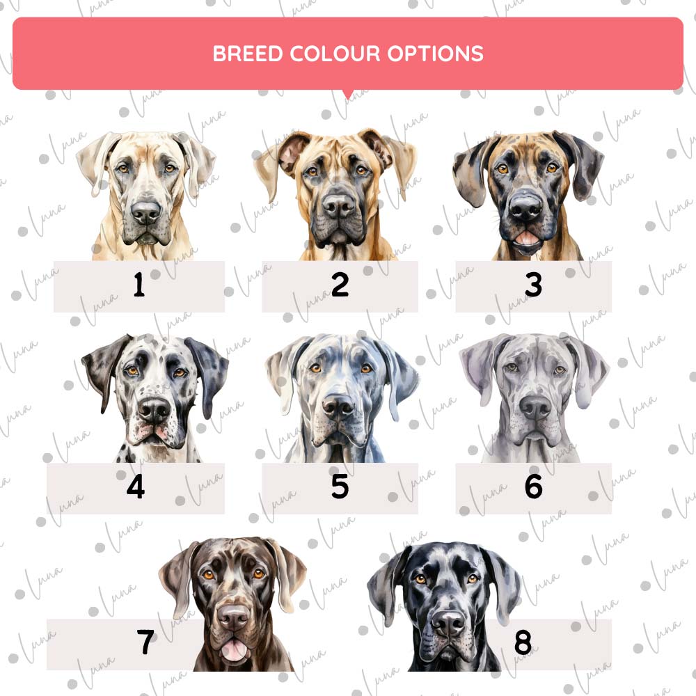 • Soft watercolour-style Great Dane illustration with your chosen breed colouring