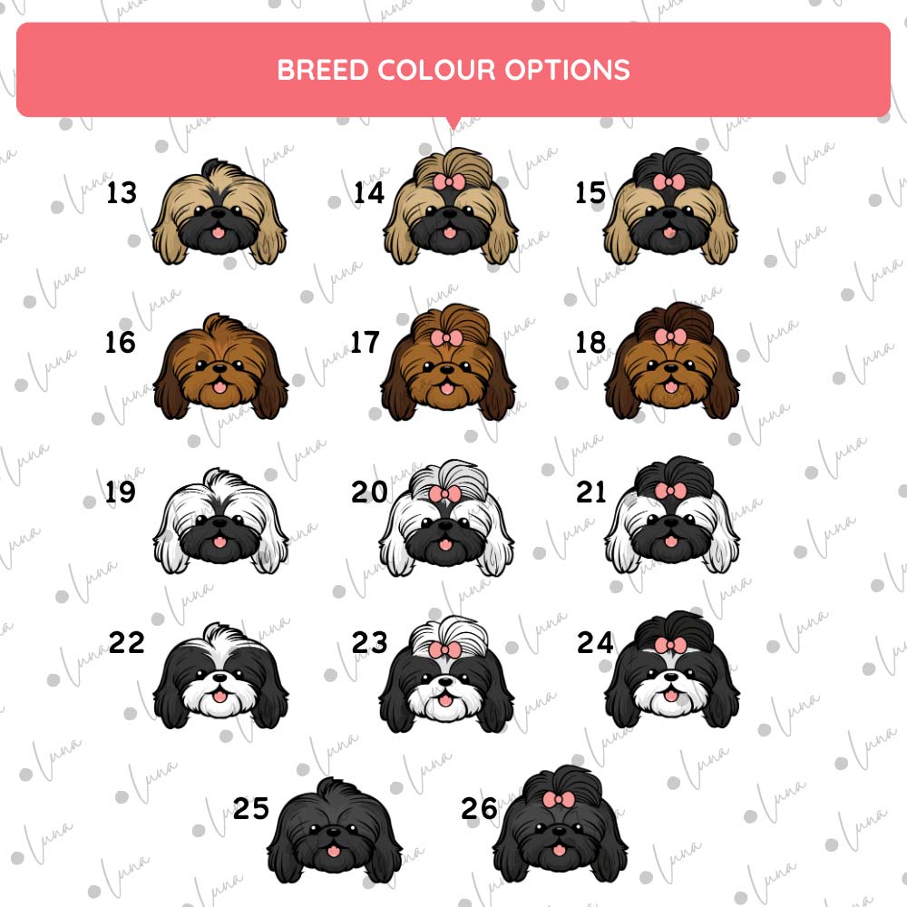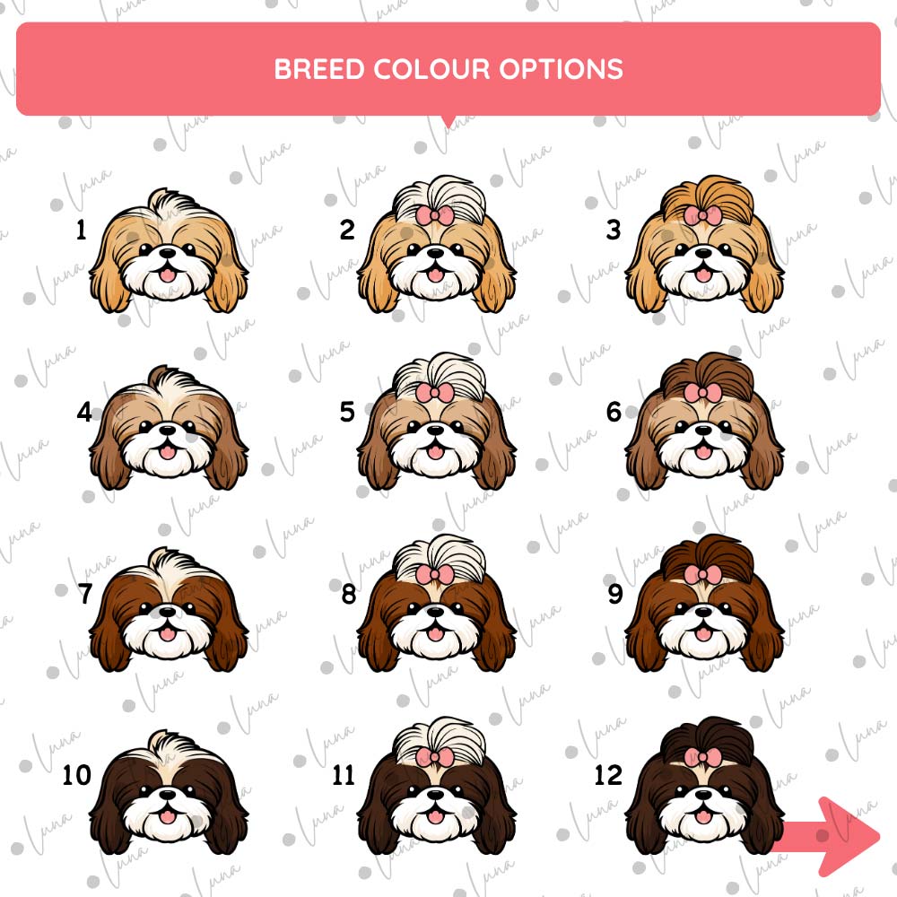 • Cartoon-style illustration with custom Shih Tzu colouring