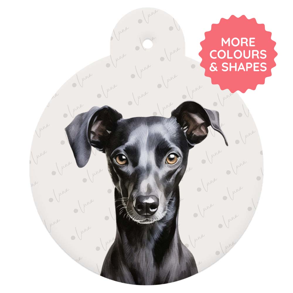 Our watercolour style brings out the Whippet’s sleek beauty and calm charm in soft, flowing detail. With your choice of background and custom text, this tag is a subtle yet stunning tribute to your sensitive speedster.