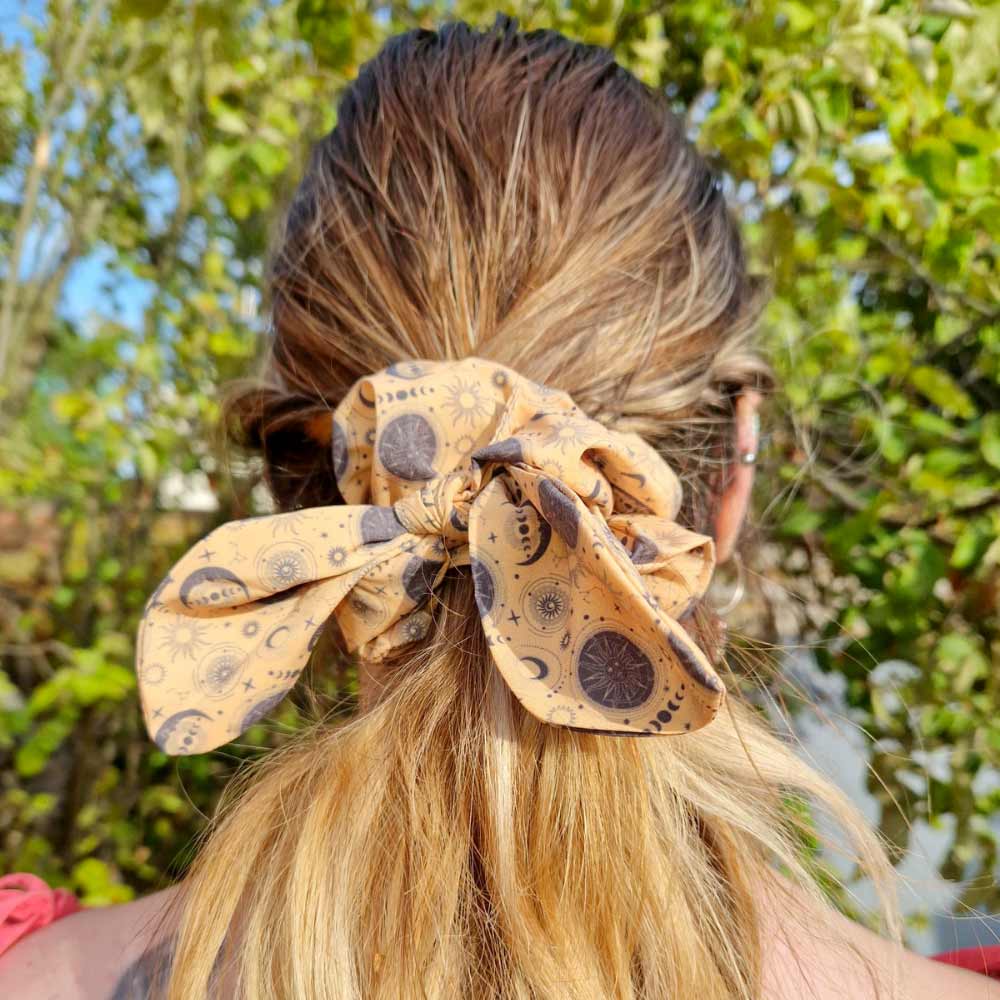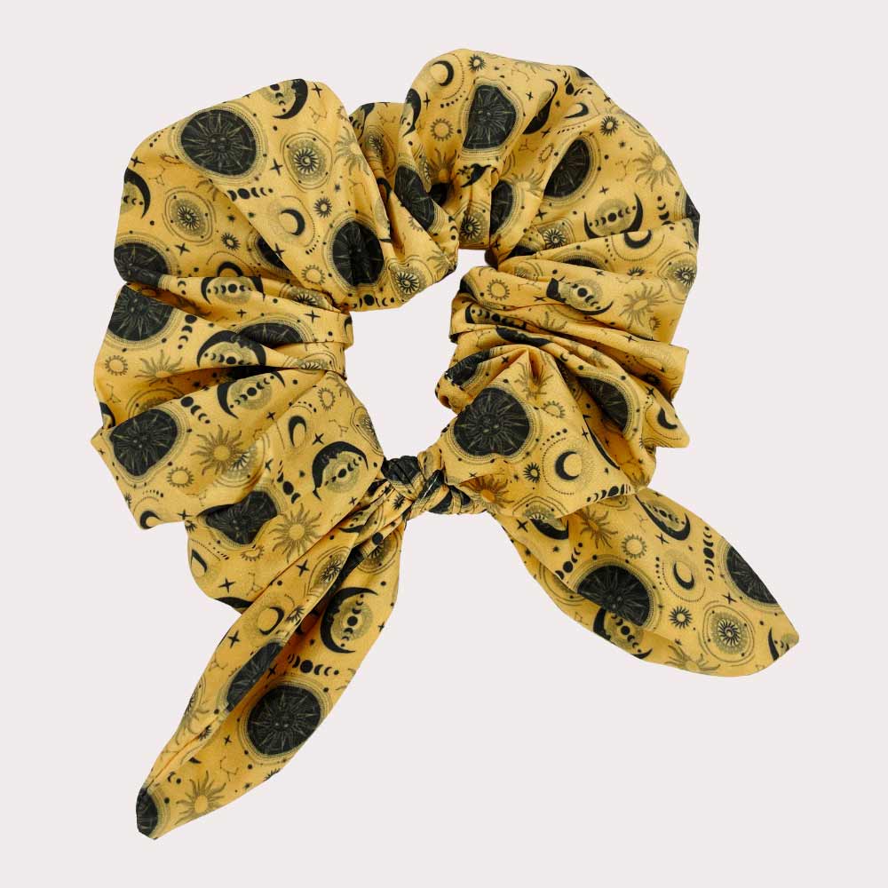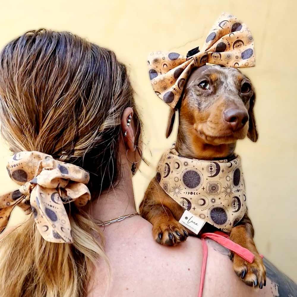 The Supernova hair scrunchie features our exclusive black and gold celestial print and comes with a removable bow for extra flair. Soft, stretchy, and gentle on your hair, it’s a perfect match for your dog’s Supernova accessories – whether you go full twinning or just a touch of stardust.