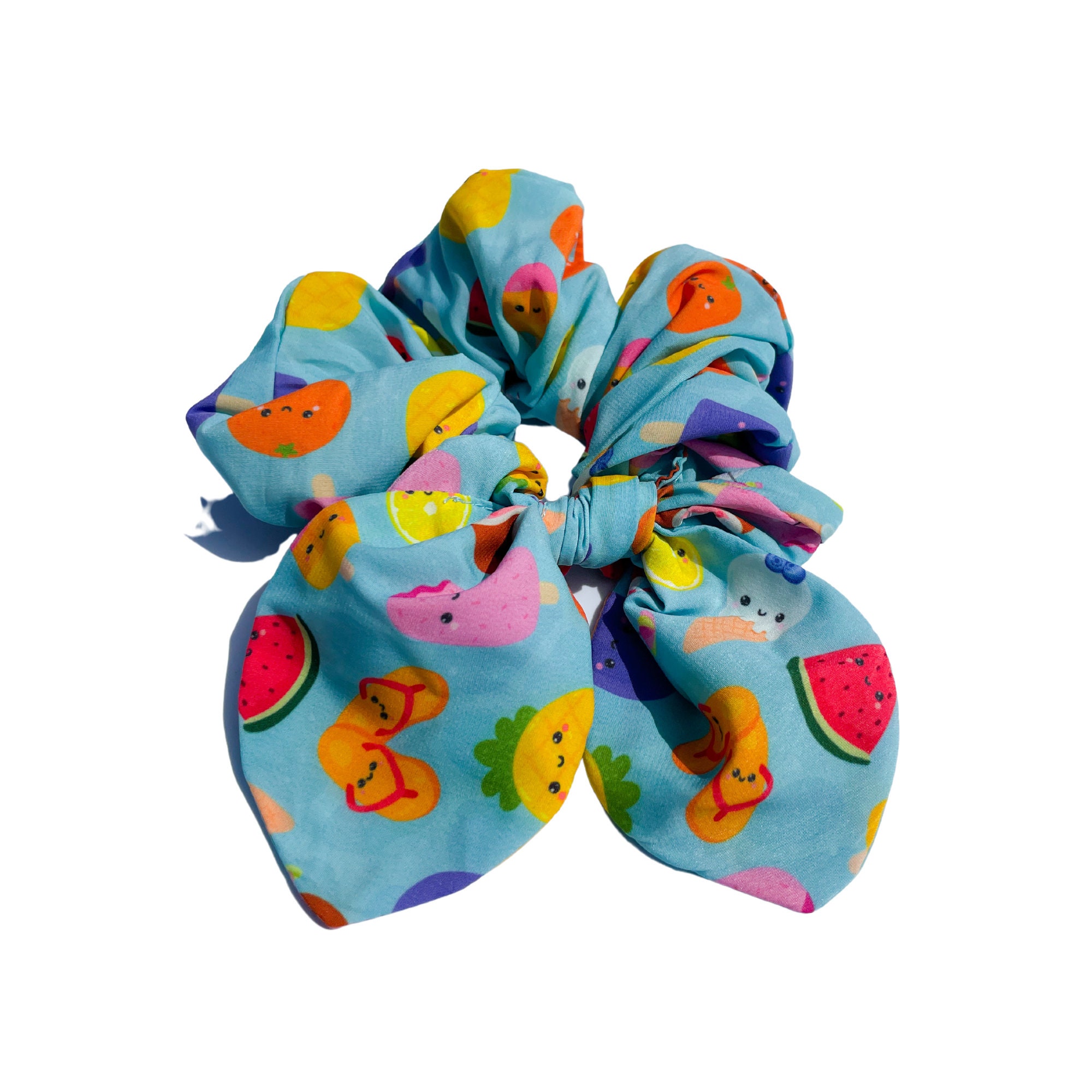 This listing is for one "Tropical Party – Blue" hair scrunchie.