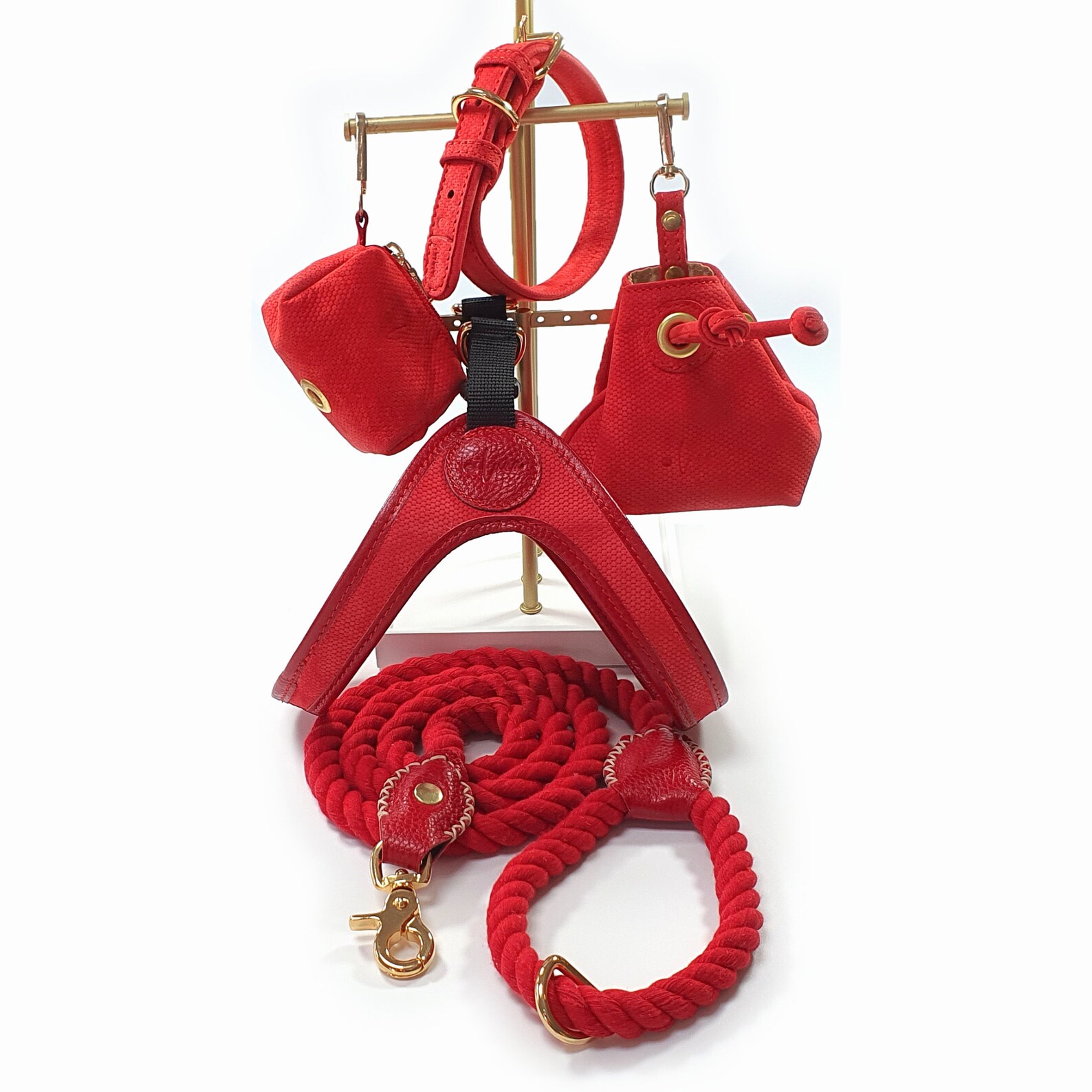 As shown in the photos, matching products can be purchased separately to complete the look including harnesses, rope leads with leather accents, collars and treat bags.
